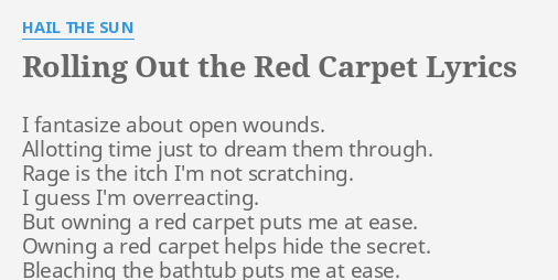 The lyrics for rolling out the red carpet by hail the sun have been translated into 2 languages i fantasize about open wounds allotting time just to dream them through rage is the itch i m not scratching i guess i m overreacting but owning a red carpet puts me at ease owning a red carpet helps hide the secret bleaching the bathtub puts me at ease it puts me at ease.